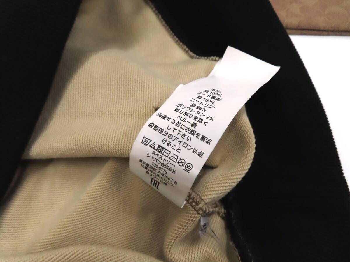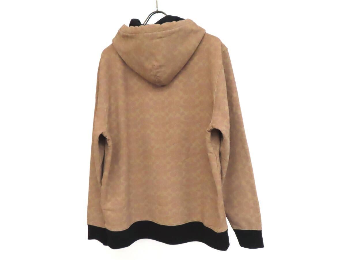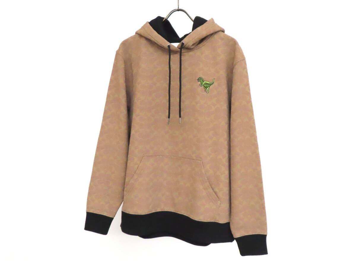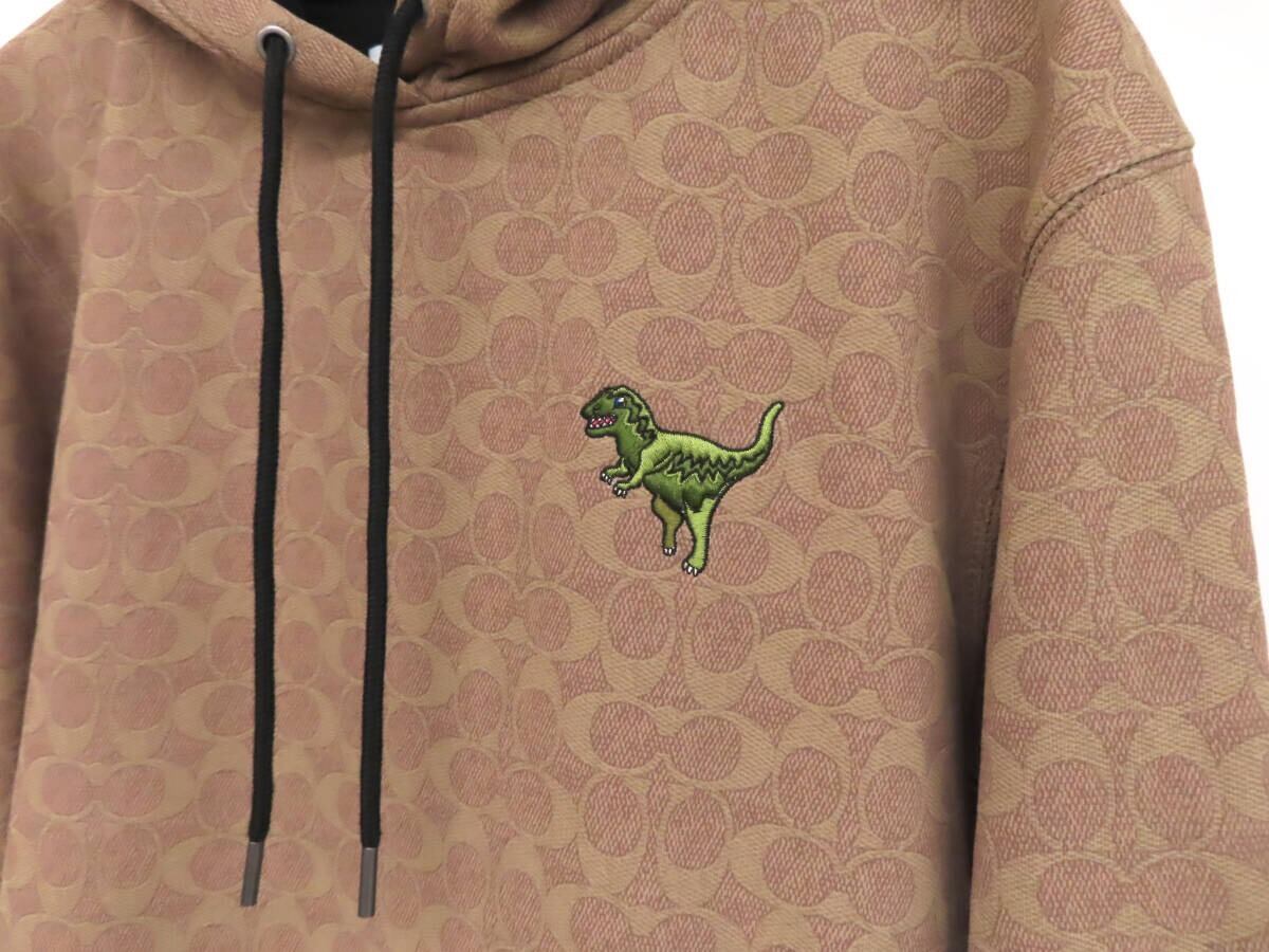 【美品】 COACH コーチ レキシー 恐竜 刺繍 シグネチャー柄 プルオーバー スウェット パーカー オーバーサイズ S ベージュ系×黒 メンズ