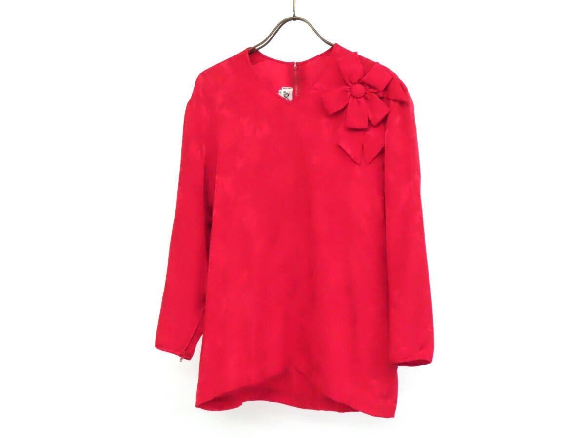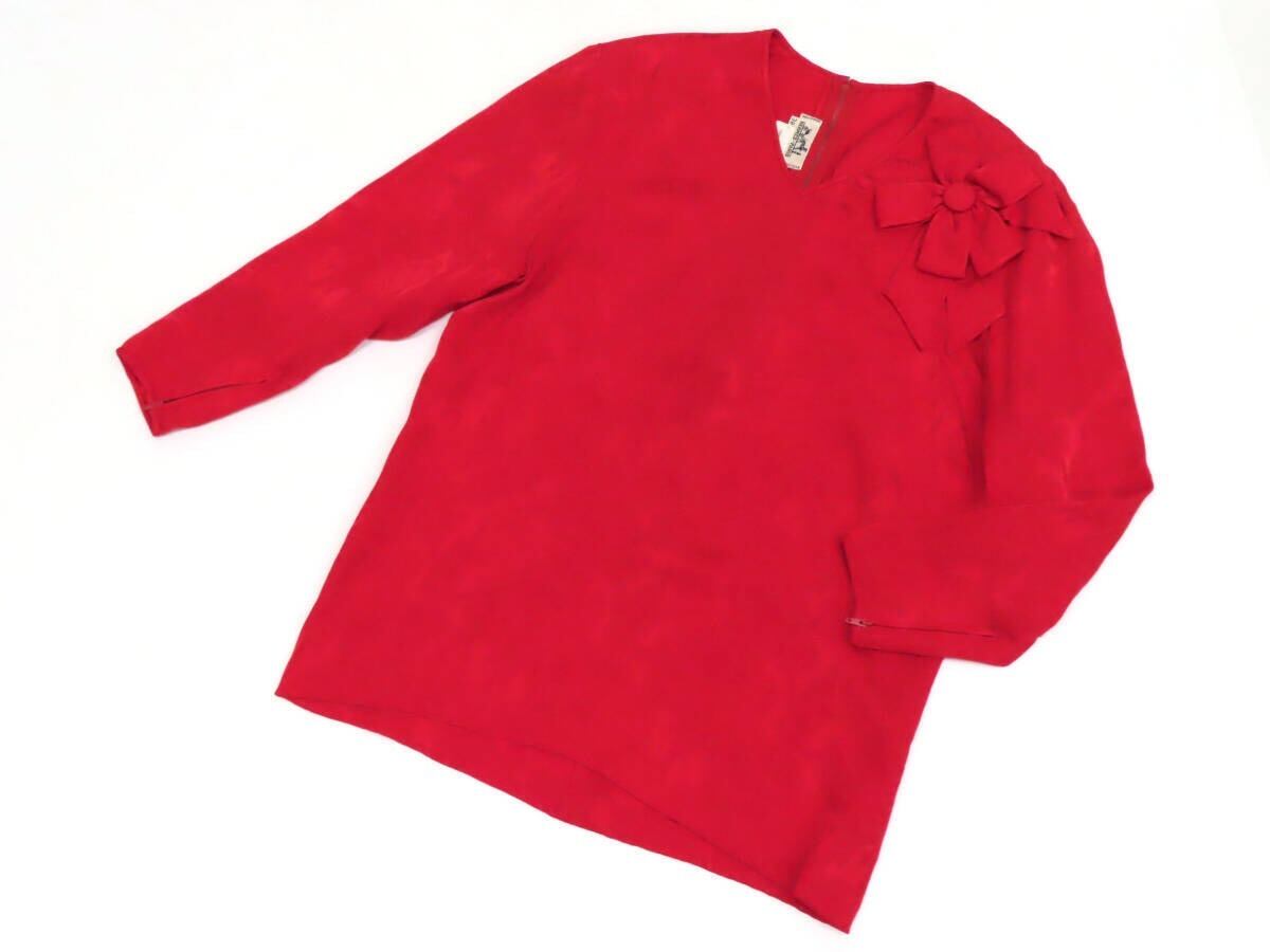 【美品】HERMES エルメス リボン 亀 タートル 総柄 シルク 絹 長袖 プルオーバー ブラウス チュニック size38 赤 フランス製 レディース