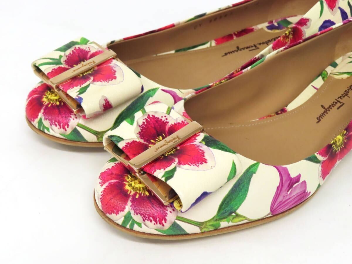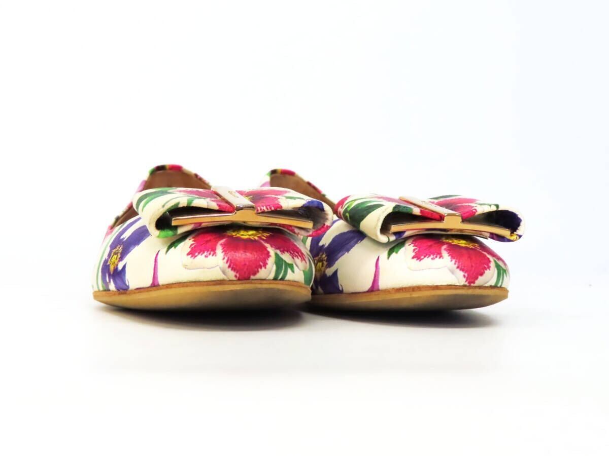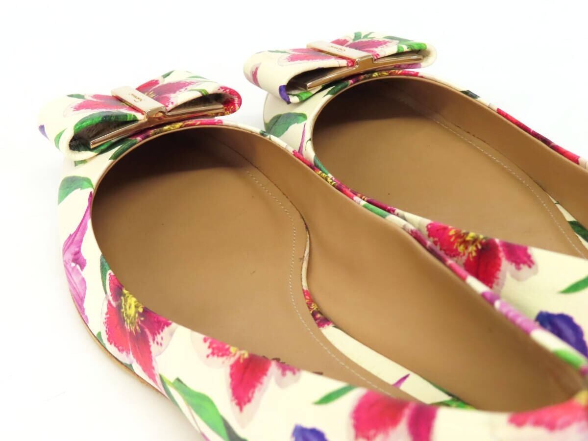 【美品】 Salvatore Ferragamo フェラガモ ヴァラ リボン 花柄 プリント レザー ローヒール パンプス スリッポン 靴 size6D マルチ 伊製