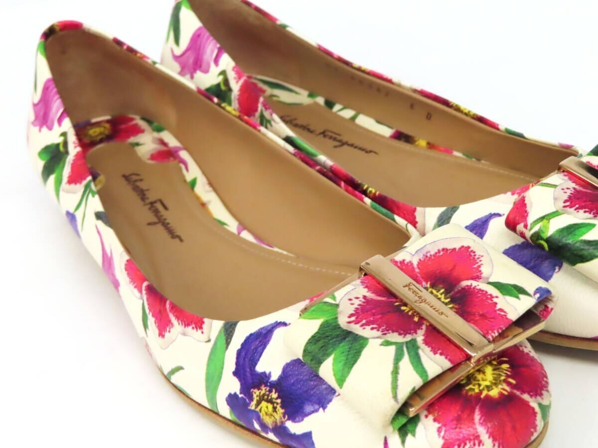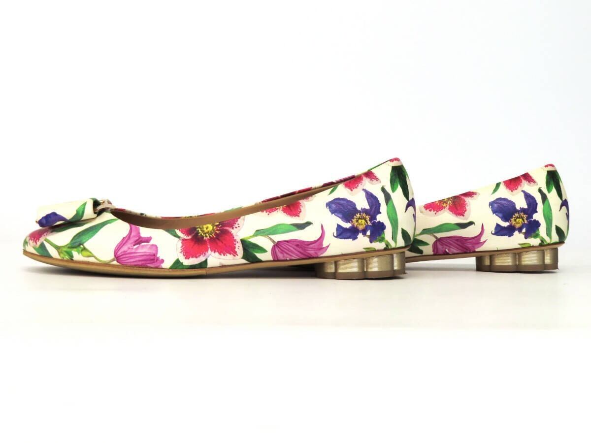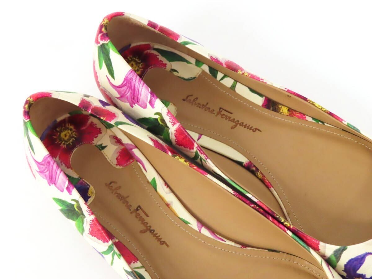 【美品】 Salvatore Ferragamo フェラガモ ヴァラ リボン 花柄 プリント レザー ローヒール パンプス スリッポン 靴 size6D マルチ 伊製