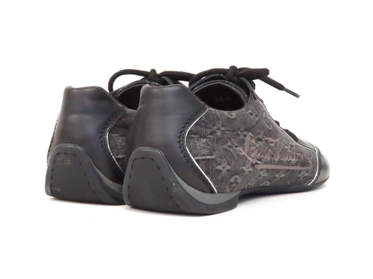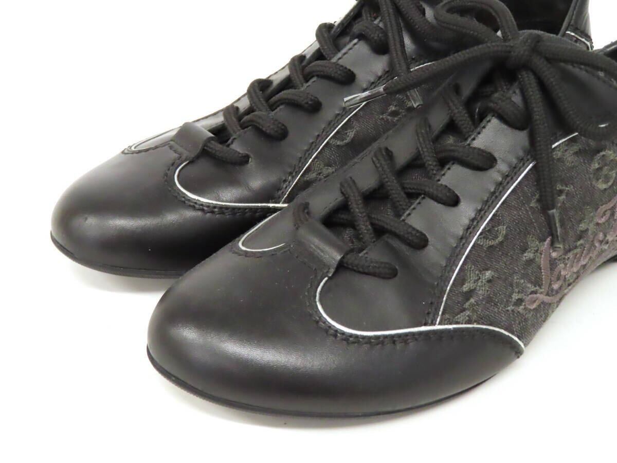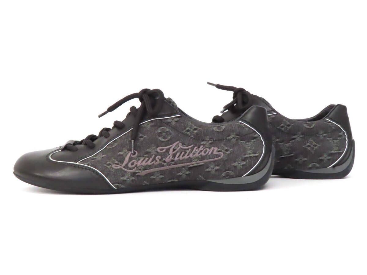 【美品】 LOUIS VUITTON ヴィトン モノグラム ロゴ刺繍 デニム キャンバス×レザー ローカット レースアップ スニーカー 靴 35.5 黒 伊製