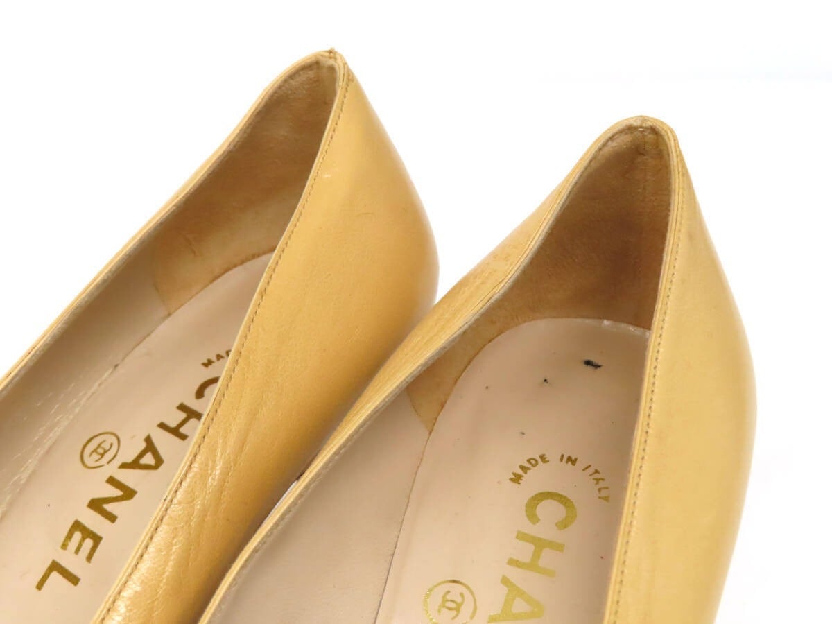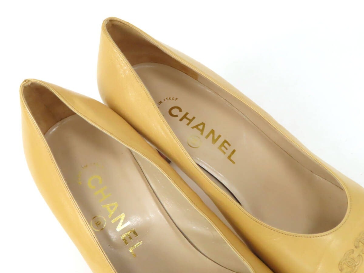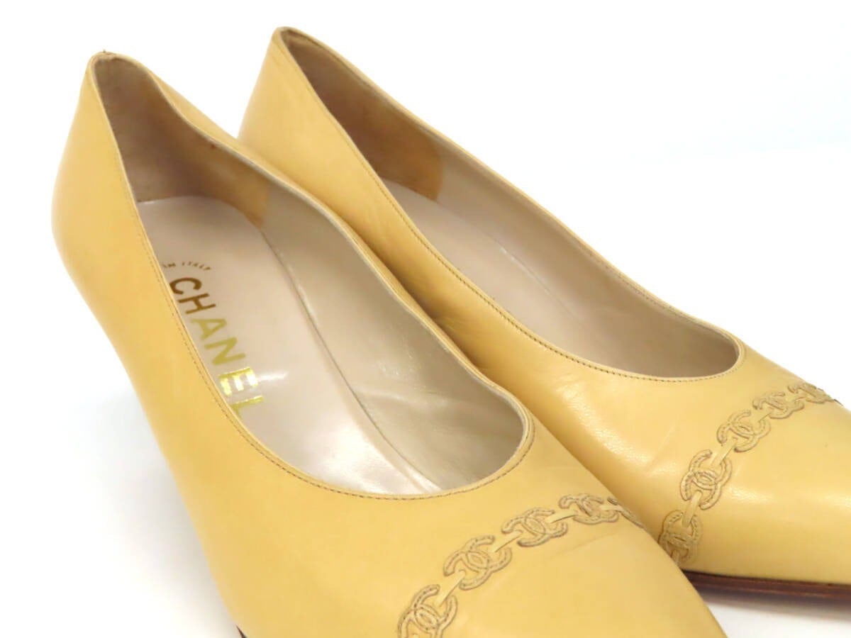 【美品】 CHANEL シャネル ココマーク ライン アーモンドトゥ レザー パンプス ハイヒール シューズ 靴 size37.5 ベージュ イタリア製