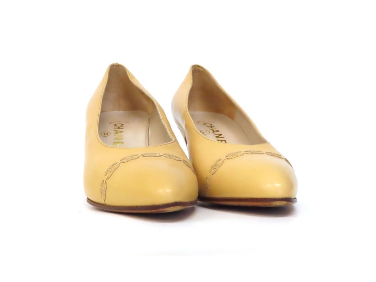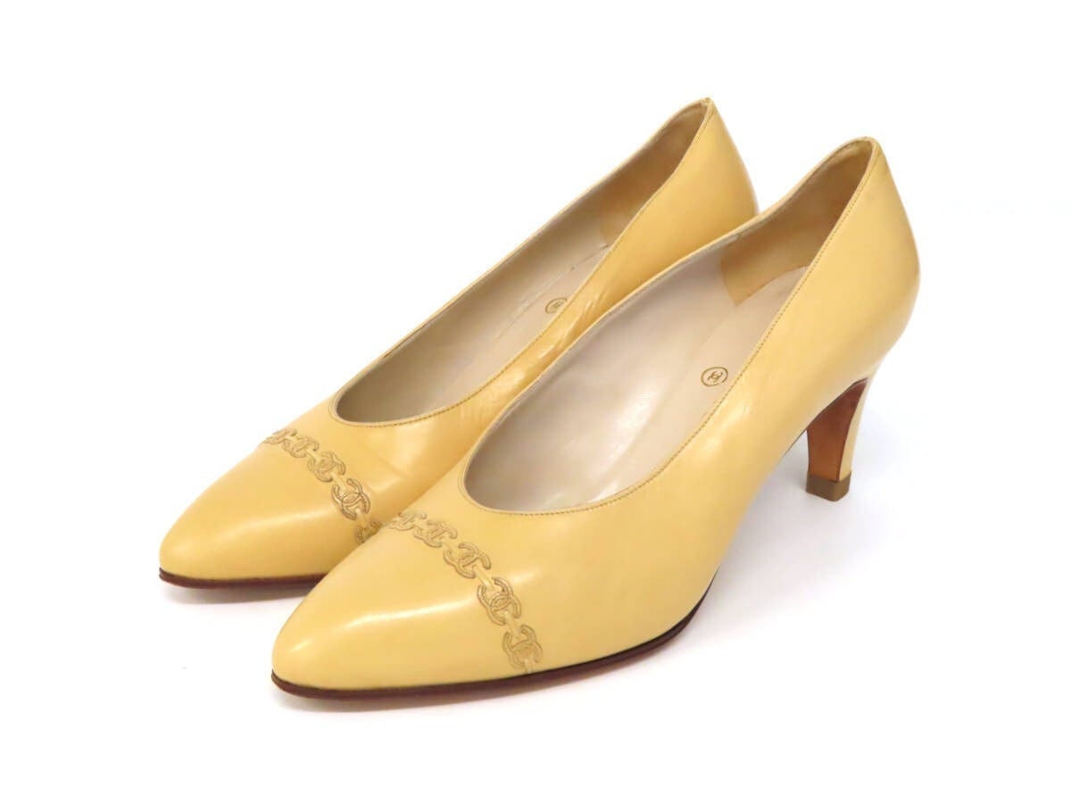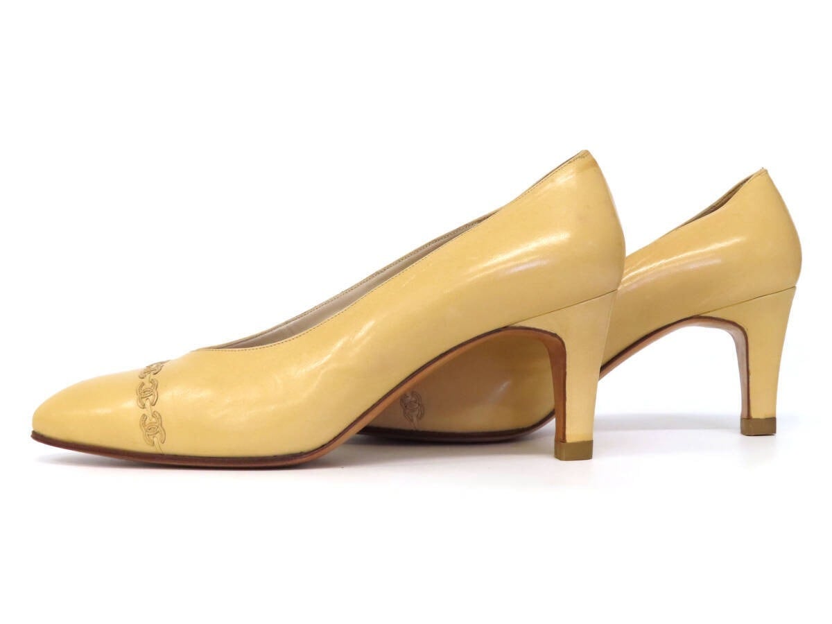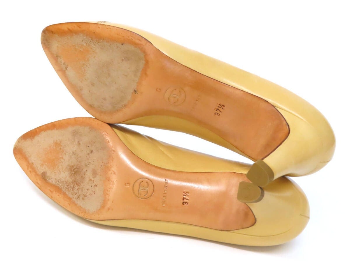 【美品】 CHANEL シャネル ココマーク ライン アーモンドトゥ レザー パンプス ハイヒール シューズ 靴 size37.5 ベージュ イタリア製